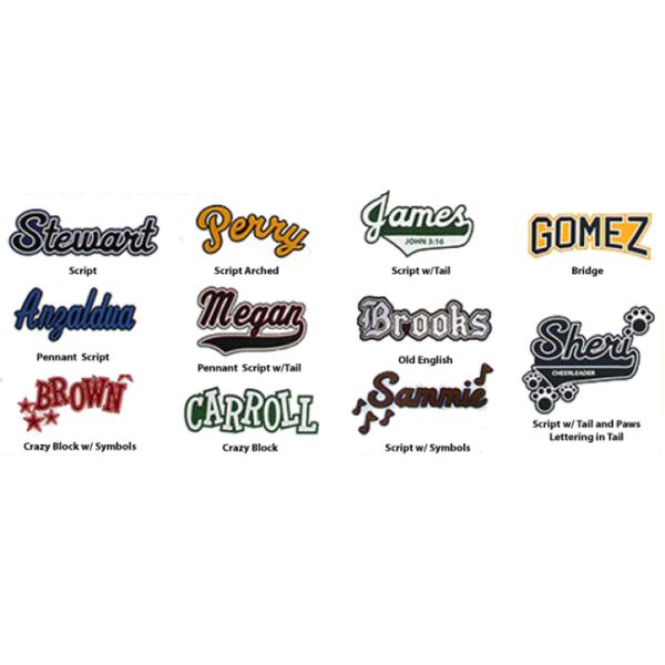 These beautiful script chenille jacket patches are as personalized as you get! And with our online builder, you can see a virtual preview of nearly any name or text you want to display on your varsity jacket. Our script chenille patches are available in 2″ script chenille, 3″ script chenille and 4″ script chenille sizes, and with our without a tail below the text. Add swiss inserts to script patches with tails for a completely personalized design.